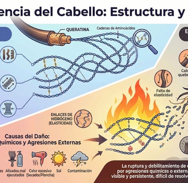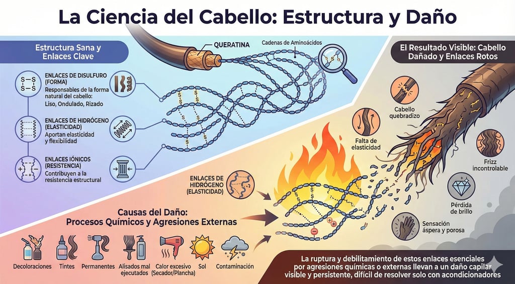 El cabello está compuesto principalmente por queratina, una proteína formada por cadenas de aminoácidos unidas entre sí mediante distintos tipos de enlaces químicos. Los enlaces de disulfuro son los responsables de la forma natural del cabello —que sea liso, ondulado o rizado—. Los enlaces de hidrógeno aportan elasticidad y flexibilidad. Y los enlaces iónicos contribuyen a la resistencia estructural. Cuando el cabello sufre procesos químicos agresivos (decoloraciones, tintes, permanentes, alisados mal ejecutados) o agresiones externas (calor excesivo, sol, contaminación), estos enlaces se debilitan o directamente se rompen. El resultado es visible: cabello quebradizo, falta de elasticidad, puntas abiertas, frizz incontrolable, pérdida de brillo y esa sensación áspera y porosa que ningún acondicionador parece resolver.